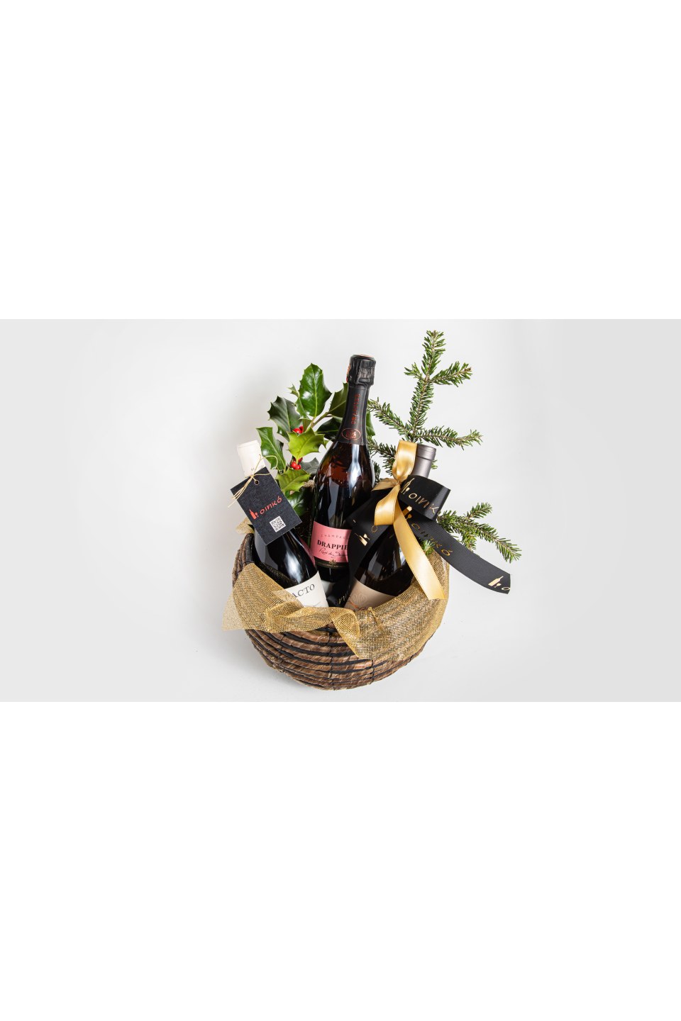 Ψάθινο στρογγυλό πανέρι με τρείς φιάλες.